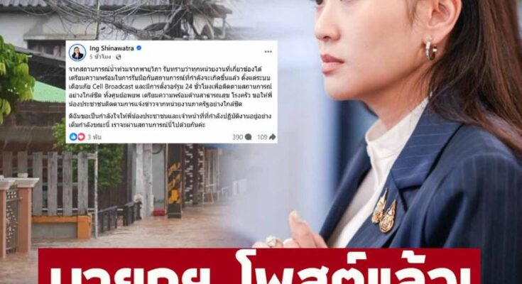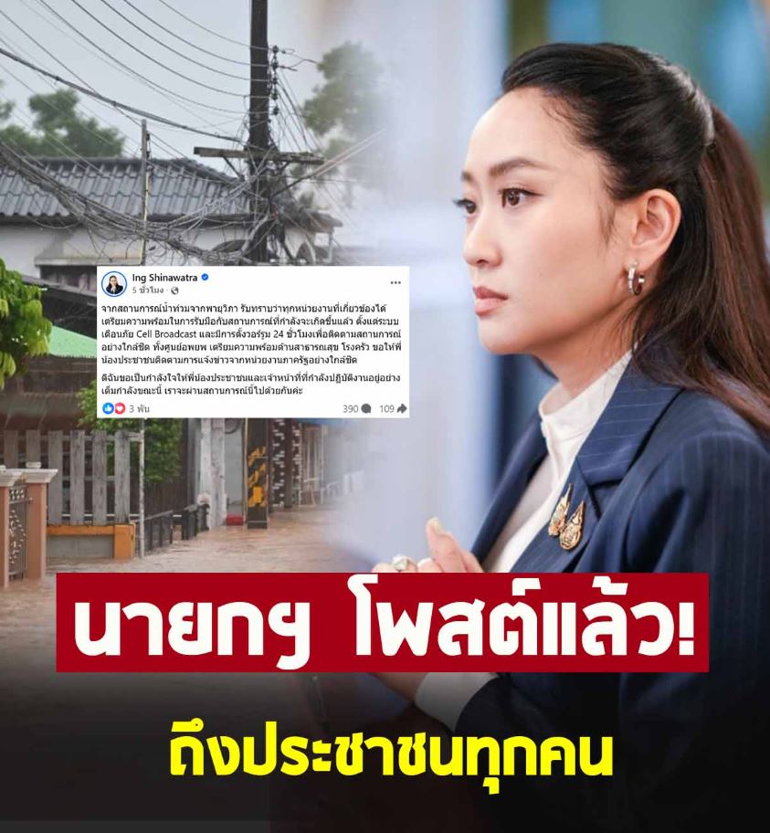 โดยทางด้านของ นางสาวแพทองธาร ชินวัตร นายกรัฐมนตรี ได้ออกมาโพสต์ข้อความผ่านเฟซบุ๊ก ถึงสถานการณ์น้ำท่วมในตอนนี้เอาไว้ว่า